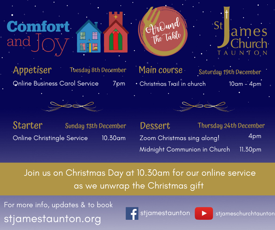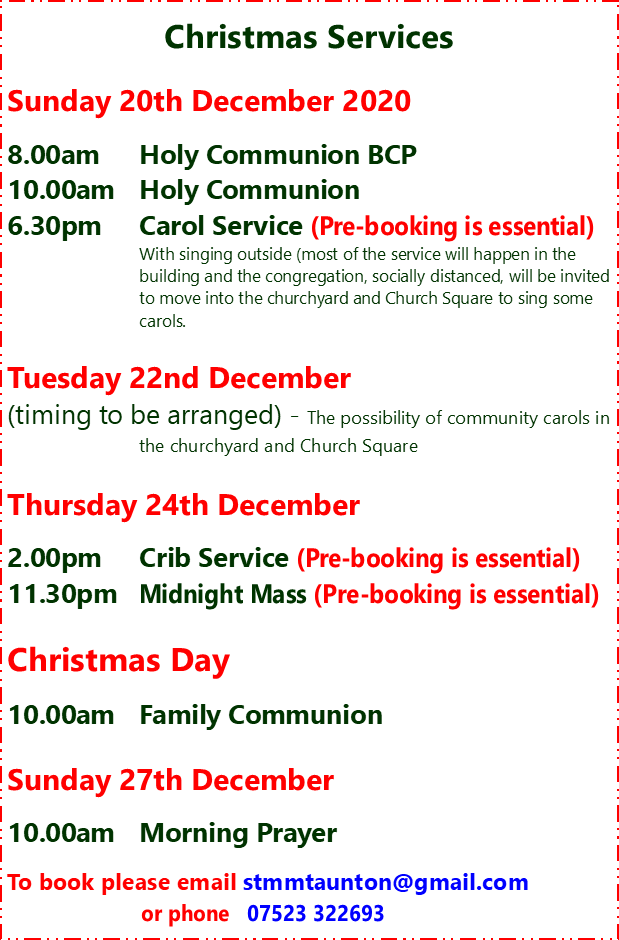 St Peter and St Paul Church in Bishops Hull will be broadcasting the following services over the Advent / Christmas season. They will all be available live on our Facebook page: St Peter and St Paul, Bishops Hull. They are posted to our website, https://www.stpeterandstpaul.org.uk/, after they have been broadcast.